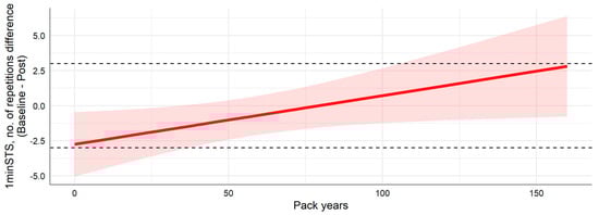 Participants with higher tobacco load tend to have their number of 1minSTS repetitions reduced over the lockdown period. On average, an increase of approximately 28.8 unit in pack-years tends to increase d1minSTS by 1 repetition (CI95 ≈ [0.07, 1.93]). Participants do not tend to recover nor reduce their number of repetitions above the MCID (Figure 5).