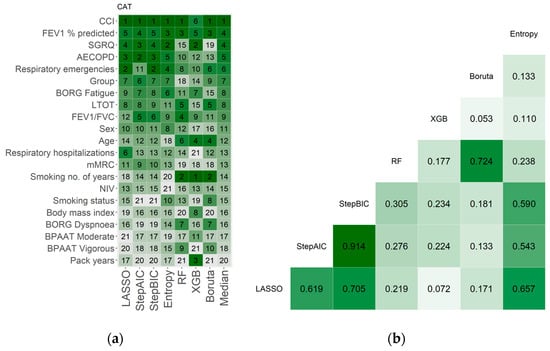 (a) COPD assessment test (CAT) feature’s importance according to LASSO, AIC based stepwise automatic selection (StepAIC), BIC based stepwise automatic selection (StepBIC), normalized entropy (Entropy), random forest (RF), extreme gradient boosting (XGB) and Boruta algorithms in people with chronic obstructive pulmonary disease (COPD) (n = 42). The dark green to white gradient represent the decreasing of the features’ importance. (b) Kendall’s rank coefficient of correlation. The dark green to dark red gradient represent the decreasing of the value of Kendall’s rank coefficient of correlation, with white corresponding to zero. Abbreviations: AECOPD, acute exacerbation of COPD; BPAAT, brief physical activity assessment tool; BMI, body mass index; CCI, Charlson comorbidity index; FEV1, forced expiratory volume in 1 s; FVC, forced vital capacity; LTOT, long-term oxygen therapy; mMRC, modified medical council dyspnoea scale; NIV, non-invasive ventilation; SGRQ, St. George’s respiratory questionnaire.