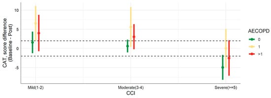 Predicted difference between baseline and post COPD assessment test (CAT) score of people with chronic obstructive pulmonary disease (COPD). Abbreviations: AECOPD, number of acute exacerbations of COPD; CCI, Charlson comorbidity index. Dashed lines represent the minimal clinically important difference.