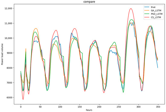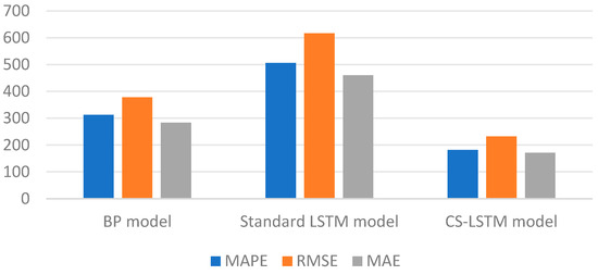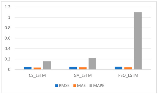 The data in Figure 12 can more intuitively show the prediction accuracy of the three methods. The most accurate prediction is that of the CS-LSTM. It shows that the difference between the predicted value and the true value of the LSTM model optimized by the CS is the smallest. The MAPE value, RMSE value and MSE value of the CS-LSTM are, respectively, 0.047, 0.037 and 0.156. Compared with the GA-LSTM neural network method, the MAPE value, RMSE value and MSE value decreased by 0.004, 0.005, and 0.066, indicating that the predicted value of the CS-LSTM is closer to the real value and could improve the accuracy of load prediction. Compared with the PSO-LSTM method, the MAPE value decreased by 0.005, the RMSE value decreased by 0.005, and the MSE value decreased by 0.939. It shows that the CS algorithm can improve the LSTM model’s ability to optimize hyperparameters, and the prediction performance of the model is obviously improved.