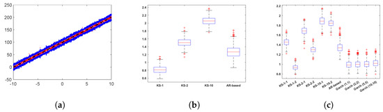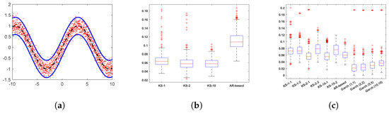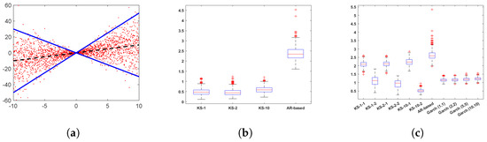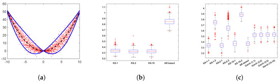 - Results. The results for this example are presented in Figure 4b,c. The best performance in the estimation of is obtained by KS-1-2 and all the GARCH models (as expected in this case). The AR-based and KS-2-2 also provided close values of MAE. In this example, clearly, M2 outperforms M1. We remark that, even in this scenario that is particularly favorable for the GARCH models, all the proposed methods provide competitive results. The highest (hence worst) MAEs values are provided by the KS with , which is a quite extreme tuning/choice of this parameter, especially when the volatility follows an autoregressive rule. Indeed, a Laplacian kernel with is more adequate in this framework. For further considerations, see ([28] Section 10).