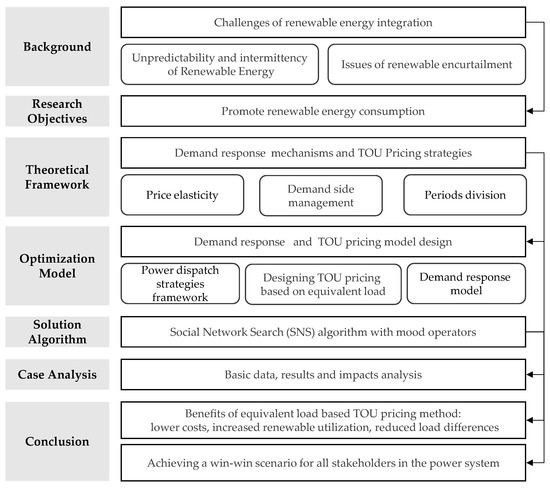 From a demand response perspective, this paper designs a TOU pricing mechanism based on equivalent load, taking into account renewable energy consumption and generation costs, to facilitate the transition of the new power system from “source following load changes” to “source–load interaction”. Firstly, a method for computing equivalent load is proposed based on the typical load of the power grid. By introducing the responsibility weight of renewable energy power consumption as the equivalent coefficient, an equivalent load curve reflecting the power source structure is generated. Secondly, a demand response model is constructed to eliminate the influence of natural trends, avoiding overestimating the degree of user response to electricity prices. Finally, with the lowest cost on the power source side as the optimization goal, and increasing the utilization rate of renewable energy and reducing the peak–valley difference of the power grid load as constraints, a Time of Use pricing optimization model is designed. The TOU pricing model is solved using a metaheuristic algorithm known as the Social Network Search (SNS) algorithm. By incorporating four innovative optimization operators (moods): Imitation, Conversation, Disputation, and Innovation, the SNS algorithm efficiently identifies optimal pricing solutions through expressed opinions. The method proposed in this paper not only encourages the uptake of renewable energy but also achieves a reduction in generation costs without increasing electricity expenses for users. Moreover, it contributes to the stabilization of power grid loads, leading to a mutually beneficial outcome for all stakeholders within the power system. Figure 1 serves as a comprehensive structural diagram that delineates the organization of this paper.