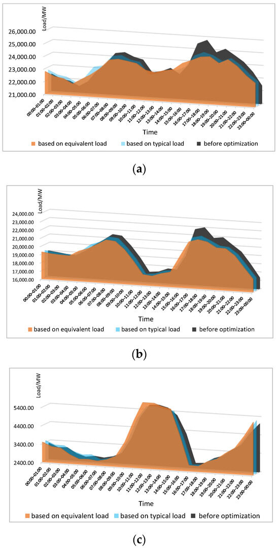 Figure 11 presents the load changes on the supply side following the optimization of the Time of Use electricity price based on typical load, net load, and equivalent load. The results demonstrate substantial peak-cutting and valley-filling effects on the load on the supply side, as detailed below: