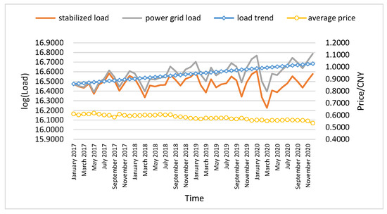 The idealized demand response model based on the price elasticity assumes that elasticity coefficients are the same in the same period. In reality, demand response by electricity users is influenced not only by electricity prices but also by factors such as the industry and individual characteristics of electricity users. With the steady growth of electricity consumption due to economic development in China, the average electricity price is gradually decreasing. Figure 6 shows the logarithm of the power grid load and the time series of electricity prices for each month in a certain location over four consecutive years. The gray line represents the grid load, the blue diagonal line represents the growth trend, the orange line represents the stabilized grid load after removing the trend component, and the yellow line represents the average electricity price. Figure 6 reveals an upward trend in overall grid load alongside a downward trend in average electricity prices. However, focusing solely on the correlation between electricity consumption and prices may overlook the inherent growth in consumption driven by economic expansion. Conclusions drawn from the rise in consumption attributed solely to price reductions can be biased, potentially exaggerating the responsiveness of electricity users to price changes.