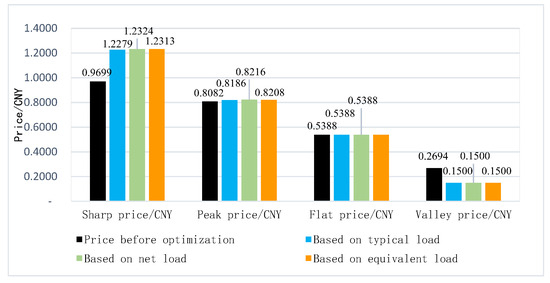 The initial sharp–valley price difference was 0.7 CNY, with a sharp–valley ratio of 2.6. Following the optimization process, which utilized the equivalent load, net load, and typical load methods, prices during sharp and peak periods experienced a significant increase, while prices during the valley period decreased substantially. Figure 10 illustrates that the sharp–valley price difference achieved through the equivalent load method is 1.0813 CNY, with a sharp–valley ratio of 8.2. This represents a notable 3.6 times increase compared to the pre-optimization state, thereby enhancing price adjustment flexibility and strengthening the demand response from consumers.