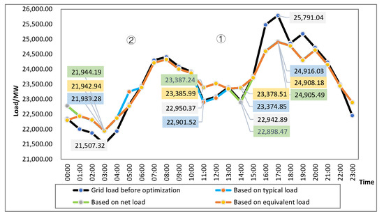 It is worth noting that during periods with more renewable energy output (area ➀ in Figure 11), only the grid supply load after optimization by the equivalent load method is higher and more stable, indicating that the output structure of the power source side has effectively been transmitted to the supply side, which can promote the power system to transition from “source follows load” to “source–load interaction”.
