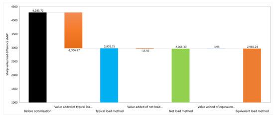 The sharp–valley load difference is further presented in Figure 12, which illustrates that the TOU pricing optimization, particularly when based on the equivalent load model, effectively manages the power supply side by reducing peak loads, increasing minimum loads, and smoothing the load differences, thereby enhancing grid stability and operational efficiency.
