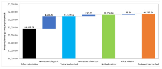 The baseline scenario is represented by a black bar, showing the renewable energy consumption at 89,822.08 MWh before any optimization. The subsequent bars in cyan, green and orange represent the renewable energy consumption after optimization using the typical load, net load, and equivalent load methods, respectively.