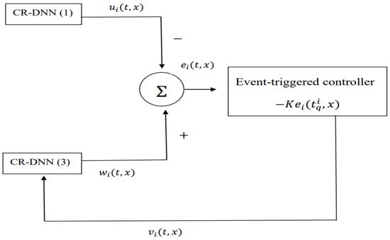 Among the above dynamics, synchronization is one of the most crucial and significant ones, which can be reflected in its vital theoretical value and various kinds of potential applications involving information processing as well as secure communication. However, NNs cannot realize synchronization by themselves due to the influence of external disturbances; consequently, some effective control strategies have been proposed by scholars for the past few years, including but not limited to feedback control [], sample-data control [], quantized control [,], pinning control [], impulsive control [], adaptive control [,], aperiodically switching control [] and event-triggered control [,,,], of which event-triggered control is a very effective control strategy; it can overcome the high cost caused by continuous control and reduce the frequency of data updates and the number of communications. In [], Jin et al. investigated the finite-time synchronization of delayed semi-markov NNs by designing an event-triggered scheme. In [], Vadivel et al. dealt with the strict dissipativity synchronization problem of static NNs under an event-triggered scheme. The robust synchronization was analyzed for master–slave NNs based on an event-triggered control method in []. The synchronization problem of inertial NNs was addressed by means of an event-triggered control approach in []. To the best of our knowledge, there is still very little work on the event-triggered control-based synchronization of CR-DNNs so far, which motivates us to carry out further research.