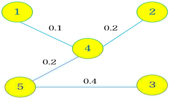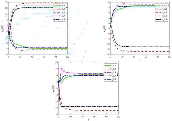 According to the value of G, the coupling topology of CR-DNN (36) is shown in Figure 2, which reveals that (36) is connected. For when the control gain matrix K is a zero matrix, that is, without external control, the dynamic trajectories of errors  and  are shown in Figure 3 and Figure 4, which show that CR-DNN (36) cannot realize synchronization. In order to realize the synchronization goal, the sampling moment is selected as , ,  and control gain matrix . , ,  and  can be obtained using the FEASP function in MATLAB. After simple calculations, the conditions of Theorem 1 are satisfied. Therefore, based on Theorem 1, CR-DNN (36) can achieve event-triggered synchronization, which is shown in Figure 5 and Figure 6.