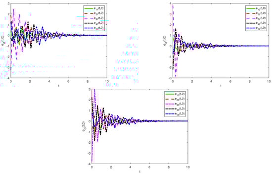 Currently, some interesting works have been conducted to discuss the influence of the parameters on synchronization [,,]. For instance, Luo et al. [] explored the influences of different triggering parameters and impulsive delays on the convergence rate. Chen et al. [] considered the connection between the settling time and controller parameters. The research in [] found that the faster the control gain, the faster the synchronization speed. Thus, in application, the values of the parameters can be adjusted according to actual needs.