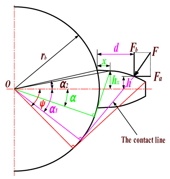 The inertia distance and cross-sectional area of the section of a cracked tooth at a distance from the base circle are denoted as and , respectively, and their expressions are given below: