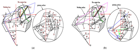 Sliced cantilever beam model of crack-failed helical gear for . (a) , and (b) , or , .
