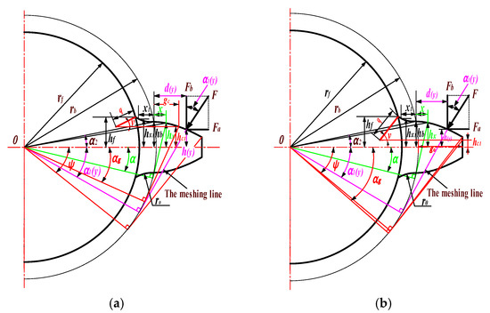 From Figure 4, it can be seen that when root crack damage occurs in the gear, the contact line length of the working teeth at the same meshing position does not change, so for the single tooth stiffness with root crack damage, the Hertzian contact stiffness does not change. For radial compression stiffness, the presence or absence of cracks does not affect the gear teeth to withstand radial loads, so the calculation of axial compression stiffness for the faulty gear teeth can also be derived according to the calculation method for normal gear teeth. Therefore, for the gear pair with root crack damage, it is only necessary to recalculate the bending stiffness and shear stiffness under the crack condition to indirectly obtain the integrated meshing stiffness with the gear pair with root crack damage. In this paper, the time-varying meshing stiffness of cracked helical gears can be calculated according to the following formula. The cracked helical gears are categorized into four cases, and the sliced cantilever beam models of their corresponding cracked spur gears are solved. Cases 1 and 2 are shown in Figure 5a,b; cases 3 and 4 are shown in Figure 6a,b.
