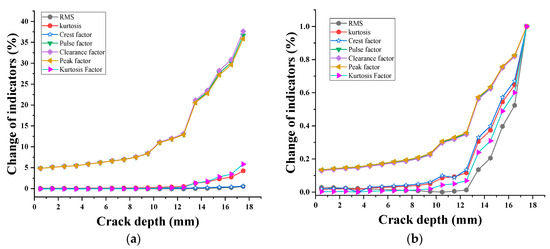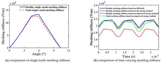 It can be seen from Figure 7a,b that the presence of tooth root cracks causes localized attenuation of the meshing stiffness. The time-varying meshing stiffness of the faulty gear solved based on the improved energy method is very close to the meshing stiffness of the fault-free helical gear simulated based on the KISSsoft method. Compared with the simulation results of the unimproved meshing stiffness, the improvement effect is obvious. Therefore, it can be proved that the improved theoretical formula of time-varying meshing stiffness of fault helical gears is effective and realistic.