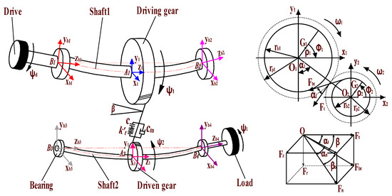 The dynamic model [29] diagram and geometrical position relationship of the faulty helical gear-rotor-bearing transmission system are shown in Figure 8.