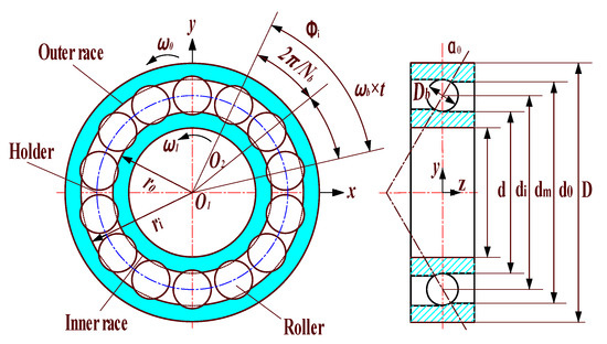 A plane model of an angular contact ball bearing is shown in Figure 9. It is assumed that the outer ring of the bearing is fixed on the housing, and the inner ring is fixed on the rotating shaft. The rolling bodies are arranged at equal angular intervals between the inner/outer rings. The velocity , at the contact point between the rolling body and the inner/outer ring of the bearing is shown in Equation (35) [29]:
