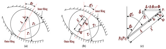 In Figure 10, and represent the distance between the centers of curvature of the grooves of the inner and outer rings of the bearing before and after loading, respectively; and are the contact angles before and after loading, respectively; and are the position of the bearing outer ring raceway curvature center before/after the force, respectively, because the bearing outer ring is fixed, the position of both are the same; and are the position of the center of curvature of the inner ring raceway of the bearing before/after the force, respectively; , , are the radial deformation, axial deformation, and angular deformation caused by the force and torque, respectively; is the radius of the inner ring raceway curvature center track; , , and are the contact deformation and total deformation of the inner and outer channel of the ball bearing, respectively.