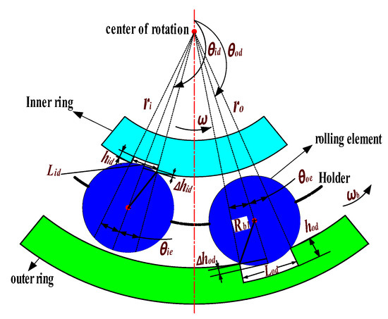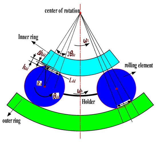 where and are the radius of bearing inner/outer rings, respectively; and are angular speeds of bearing inner/outer rings, respectively. Assuming that the rolling body is purely rolling in the ideal state, then the rotational angular velocity of the cage and the rolling body are equal, and the linear velocity of the rolling body can be expressed as:
