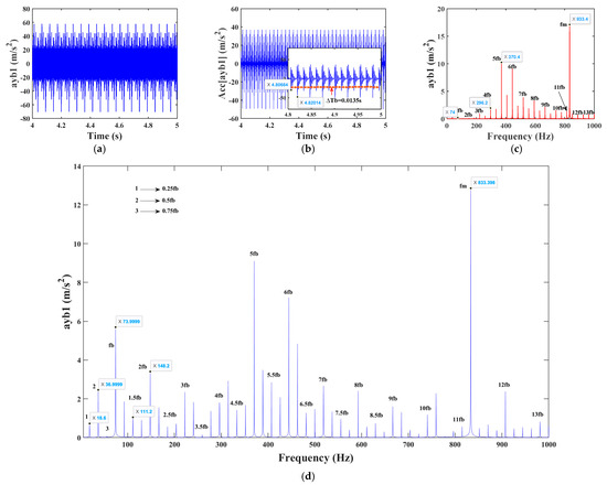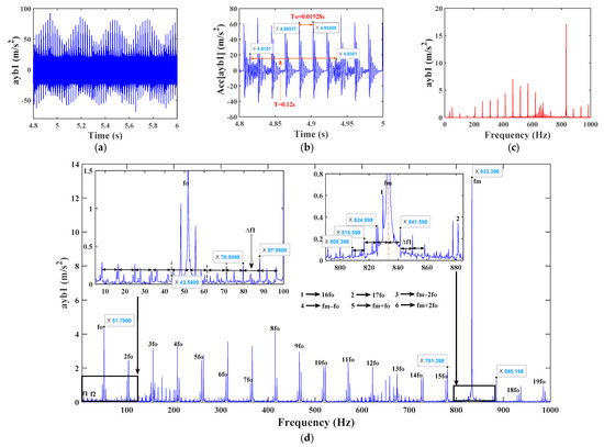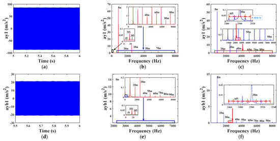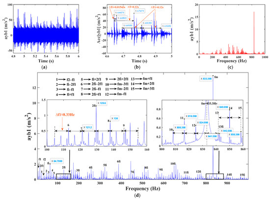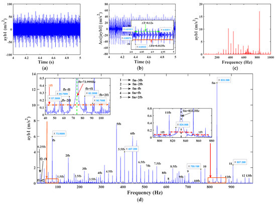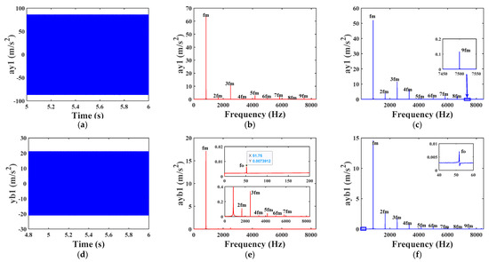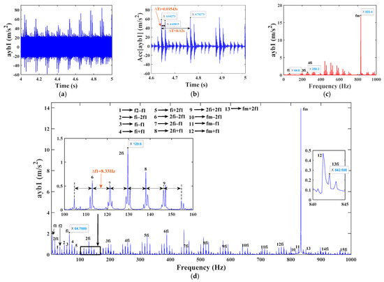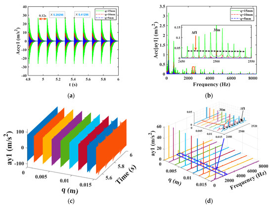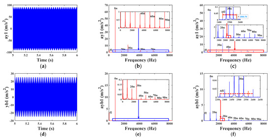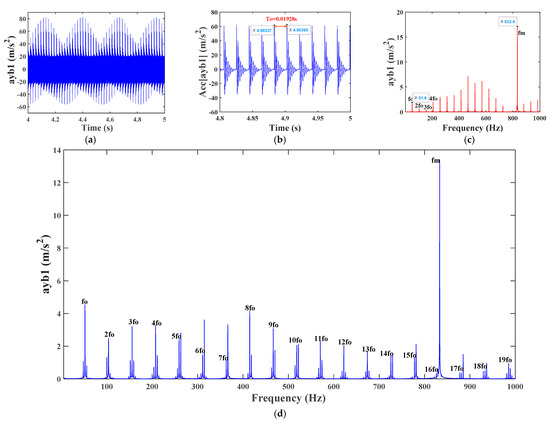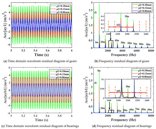 where is the integrated transmission error of the system, is the mean value of error, is the amplitude of error, and is the meshing frequency. The meshing force of the gear meshing system along the meshing line direction can be expressed as , is the faulty helical gear meshing stiffness when the crack depth mm, it is the time-varying meshing stiffness for healthy helical gears. When mm, the system does not contain gear eccentricity faults, while when it is not 0, the system has eccentricity faults. is the tooth side clearance function and can be expressed by Equation (33) [29];