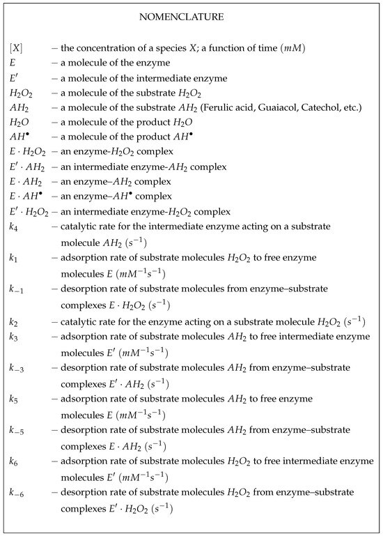 - The mixture of peroxidase enzyme, , and (such as Ferulic acid, Guaiacol, Catechol, etc.) is well stirred throughout. This implies that diffusive effects in the process can be omitted and that the concentrations of the various species in the mixture can be described by functions of time only. This further implies that the evolution of the system can be modelled using a coupled system of nonlinear fractional differential equations and that a partial differential equation model is not required [15,35].