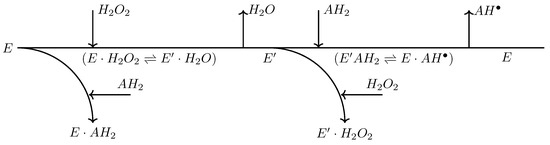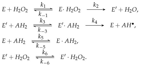 It is known that Spanish broom peroxidase catalyses the -mediated oxidation in a Ping Pong mechanism with the presence of competitive inhibition by the substrates [6]. The kinetic mechanism for the -mediated oxidation by Spanish broom peroxidase is summarised in Figure 2.