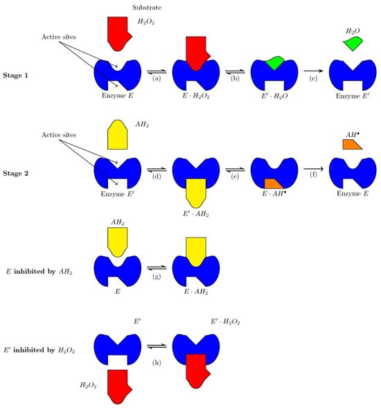 Enzymes, natural proteins found in living organisms, catalyse biochemical reactions essential for cell metabolism by reducing the activation energy. They are not consumed during reactions and can be biologically degradable, suggesting an important role in environmental protection [1,2,3,4,5]. Cells regulate metabolite concentrations through various mechanisms, including enzymatic inhibition processes such as competitive, noncompetitive, and uncompetitive inhibition. Competitive inhibition involves substrate and inhibitor molecules competing for enzyme binding sites, hindering catalytic activity. The competitive substrate inhibition of an enzyme is a competitive inhibition process in which the substrate plays the role of inhibitor, and enzymes often are bi-substrate enzymes. Some enzymes, for example, Spanish broom peroxidase, can be inhibited by their substrates [6,7].
