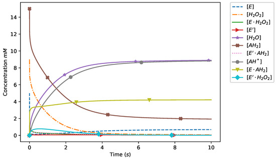 where, e0, a0, and b0 give the initial constant concentrations of the enzyme, H2O2, and AH2, respectively. The initial concentrations for all of the enzyme complexes were taken to be zero. Finally, the initial concentrations of the rest of the species were set to be zero also.