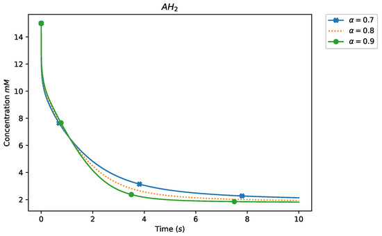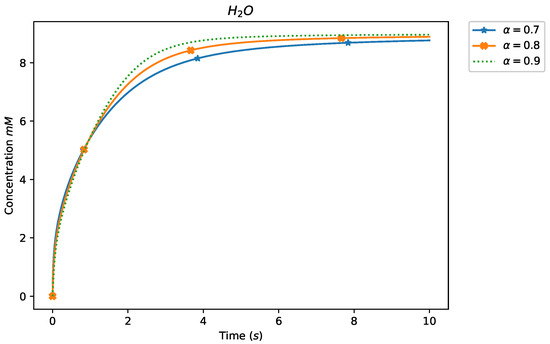 We now display some further numerical solutions inspired by the fact that the fractional order is in . That is, we conducted some numerical experiments for the different values of to obtain insights into the behaviours of the solutions of the model. These values of were taken to be , , and to reduce the computation time. In these calculations, the default values used for the parameters are shown in Table 1, and the initial concentrations for the enzyme, , and are those used in Section 3.1. We used the solutions of the model for the product and the substrate for this investigation.