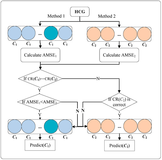 Figure 3 shows a schematic diagram of the ASS using the HCG constructed with C1 and C2 as examples. Here, C1 and C2 are still used to represent the two base classifiers generated by different algorithms. CR(C1) and CR(C2) represent their classification results for all class labels of the data instance, expressed as Boolean values. First, the structure calculates the AMSE value of the HCG and then determines whether the classification result of the HCG is the same as that of the data instance. If so, it selects the one with the smaller AMSE for testing. Otherwise, it determines whether the C2 result is correct. If it is correct, it selects C2 for testing; otherwise, it selects C1.