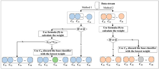 Figure 4 shows the schematic diagram of the training algorithm using the HCG constructed by C1 and C2 as an example. Here, C1 and C2 are still used to represent the two base classifiers generated by different algorithms. Formula (10) is used to calculate the weights of the base classifier of the HCG. It can be used to decide whether to update and replace the device based on the criteria. For the kth base classifier, one must determine whether the number of classifiers in the classifier ensemble is full. If it is full, the weight needs to be calculated using Formula (9), the base classifier with the lowest weight discarded, and a new base classifier added. For both base classifiers, the same replacement and update principles are applied.