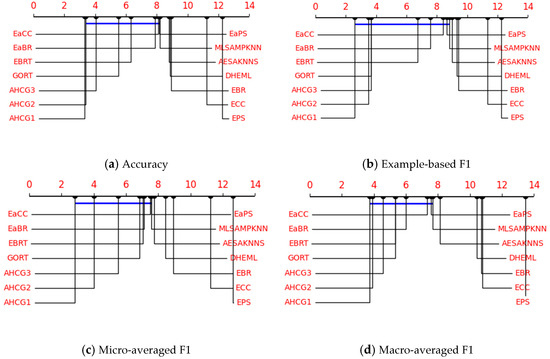 where the significance level α = 0.05, k represents the number of algorithms, and N represents the number of datasets; in this experiment, k = 14, and N = 12. Calculated using the formula, CD = 5.26. Figure 4 shows the CD plots on the assessment indicator accuracy, example-based F1, micro-averaged F1, and macro-averaged F1, where the average ranking of each algorithm is marked along the axis.