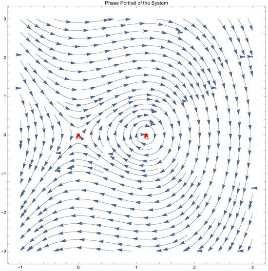 In this part, we discuss the phase portrait of Equation (10). With the help of the phase portrait, one can simply observe how solutions evolve over time for various starting conditions without actually solving the given system [34]. It is worth noting that Talafha et al. [35] studied the dynamics and solutions of the Davey Srewartson Kadomtsev Petviashvili (DSKP) equation, which is the integer–derivative version of the Fokas equation. In [35], the authors found the phase plane of the DSKP equation, which is similar to the phase plane of the Fokas equation. However, we analyze the phase plane of Equation (1) because Equation (1) is a fractional-order problem. Equation (10) can be converted to the following system by applying the Galilean transformation.