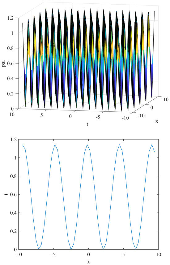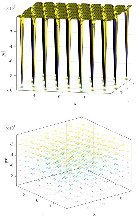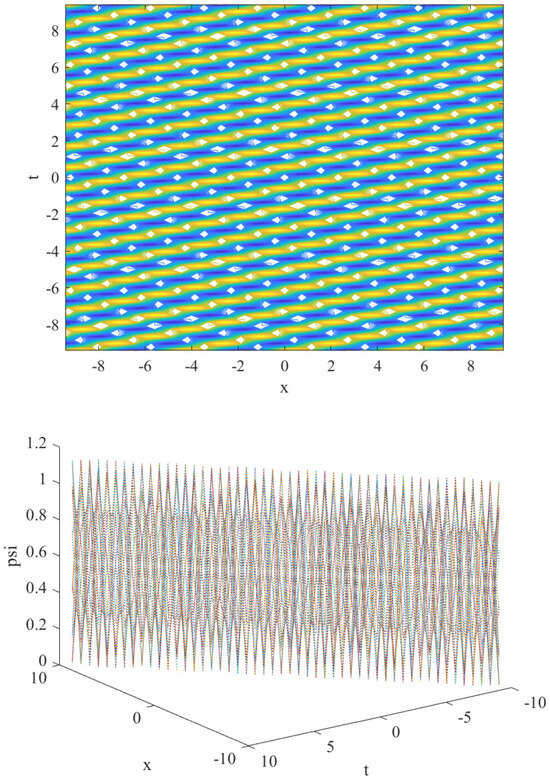 Figure 1 illustrates the existence of the traveling wave solutions. We observe that there are two equilibrium points, namely saddle and center points. The saddle point indicates that Equation (1) has solitary waves or other forms of solutions, while the center point indicates that some periodic traveling wave solutions can be generated for Equation (1). In Figure 2 (top), we show a periodic propagation for the solutions under the parameters , while Figure 2 (bottom) shows this periodic propagation when This particular kind of wave solution establishes a periodic structure, frequently observed in physical systems controlled by the considered Fokas problem, that moves through space while maintaining its shape. Furthermore, Figure 3 presents a contour and a three-dimensional plot for the solutions under the previous parameters. This contour is a three-dimensional graphical representation of the wave’s temporal and spatial oscillations. Figure 4 illustrates a three- and two-dimensional solitary wave solution for the solution under the parameters , . The Fokas equation involves solitary wave solutions because of the delicate balancing between the dispersive terms, which spreads the wave out, and the nonlinear terms, which tend to steepen the wave. The basic form of the wave is stabilized throughout propagation by this balance. Moreover, a contour and a three-dimensional plot for the solitary wave solution under the parameters are given in Figure 5, respectively. We present in Figure 6 internal three-dimensional periodic waves with their contours and another type of contour for the traveling wave solution when we use the parameters