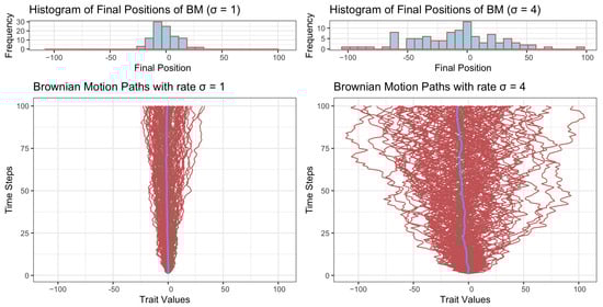 Given the initial value , Equation (3) describes the dynamic of the trait variable at time t pending the rate parameter . Figure 1 presents one hundred trajectories generated using rates (bottom left) and (bottom right), respectively. It can be seen straightforwardly that while a smaller rate () yields a narrower range of character value, the larger rate () yields a wider range of character value.