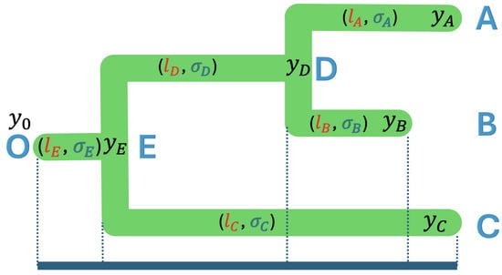Given the tree with the topology and branch lengths, one should assume that the observed trait values are a linear combination of past values, time has elapsed, and the rate of continuous trait evolution changes. To illustrate, we used a case of a 3-taxon tree as shown in Figure 3, where the extant species A, B, and C, and the fossil species D, E, and O have trait values of and . These trait values can be expressed as a linear combination of the time elapsed and the rates of continuous evolution, as shown in Equation (5):