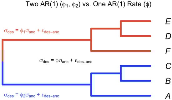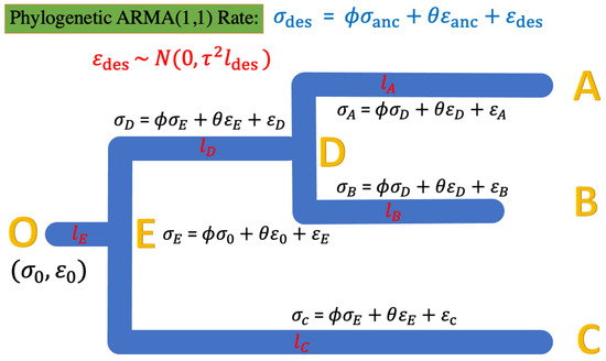 For a phylogenetic ARMA (1, 1) rate model, we denote as the descendent () and as the ancestor; thus, the model in Equation (11) can be represented as in Equation (13):