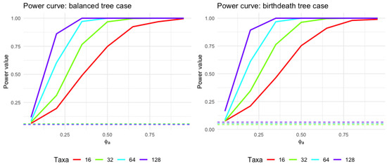 Power curve for varying taxon levels (using balanced tree and birth–death tree cases as demonstration). The horizontal axis represents an adjusted value of a parameter called , ranging from 0 to near 1. The vertical axis depicts the statistical power, indicating the probability of rejecting a null hypothesis when an alternative is true; a range from 0 suggests no detection ability, while 1 signifies certain detection. The four curves represent different taxon counts , which could indicate distinct sample sizes or biological classifications. The horizontal lines present the type I error rate using level .