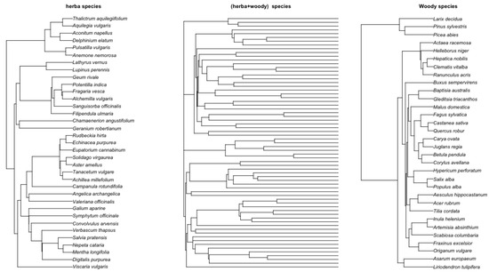 Left: Herbaticus tree. Right: Woody species Middle: Combined herbaticus and woody species. The herbaticus and woody trees were obtained using TimeTree [36], where species names are entered and the system generates the tree in Newick format. The combined tree was obtained using R ape package (version 5.8-1) function bind.tree by applying the molecular dating with a penalized likelihood approach [29] for branch-length estimation. This was performed using the R ape package (version 5.8-1) function chronopl, taking the herbaticus tree and woody tree as input.