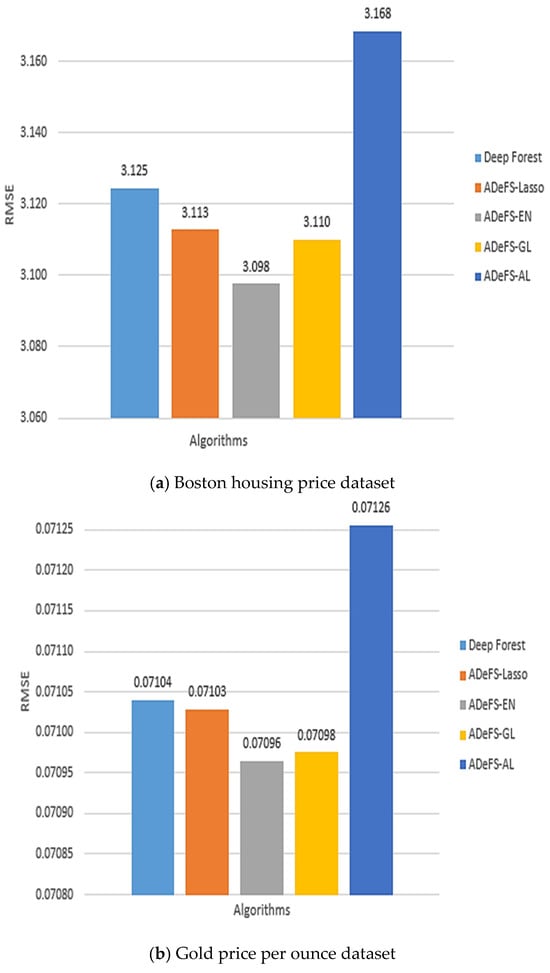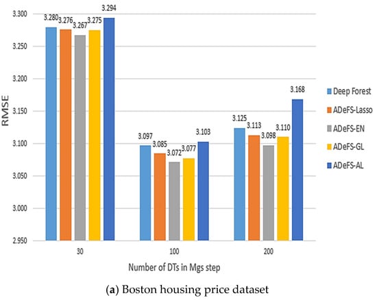 Figure 8a–c depict the outcomes of the proposed model, specifically focusing on the RMSE metric, utilizing 200 DTs in the MGS step and 500 forests in the CF step. The plots illustrate that the ADeFS-EN model outperforms other models in all three datasets in terms of RMSE, while the ADeFS-AL model presents the worst performance. This means that not only applying shrinkage techniques on the forests of the last layer in the CF step can improve the performance, but also the type of shrinkage technique is effective in further reducing the error. For example, the EN method, which simultaneously shrinks and selects the forests and performs group selection, outperforms. Although the ADeFS-EN model keeps more forests in the model, it still achieves better performance. This can be attributed to the penalty function, which combines the characteristics of ridge and LASSO regression. It receives both the shrinkage property from ridge and the property of removing them from Lasso. On the other hand, the GL method carries out group selection but does not perform better than EN. This is because the grouping of forests may lead to removing an effective group of forests from the model, resulting in higher model error.