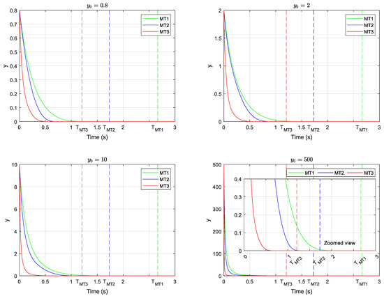 Based on the analysis above, it is evident that the proposed method achieves a faster convergence speed than the existing fixed-time control methods [27,37,38,39]. To validate this claim, numerical simulations were conducted to compare the convergence speed of the proposed method (MT3) with the methods described in Lemma 1 (denoted as MT1) and Lemma 2 (denoted as MT2). All control parameters for the methods were set identically, with values of , , , , , , and . Based on these parameters, the theoretical convergence times were computed as follows: . These results clearly indicate that the proposed method (MT3) exhibits the fastest convergence among the three approaches. Additionally, Figure 1 provides a visual comparison, highlighting the significantly improved convergence speed of the proposed method (MT3) relative to MT1 and MT2. This superior performance underscores the efficiency and effectiveness of the proposed approach in achieving rapid stabilization.