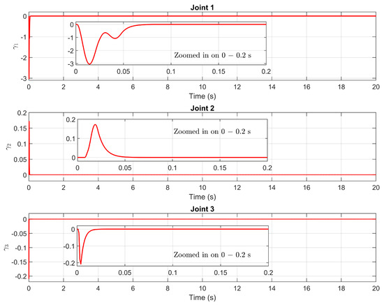 The simulation outcomes are illustrated in Figure 5, Figure 6, Figure 7, Figure 8, Figure 9 and Figure 10 and detailed in Table 2. The time evolution of the auxiliary system variables is shown in Figure 5. It is evident that these variables can converge to zero rapidly. Figure 6 depicts the trajectory tracking performance of the robot arm’s end-effector, while Figure 7 demonstrates the tracking performance at the joint level. From these figures, we can see that all four control methods successfully follow the desired trajectory.