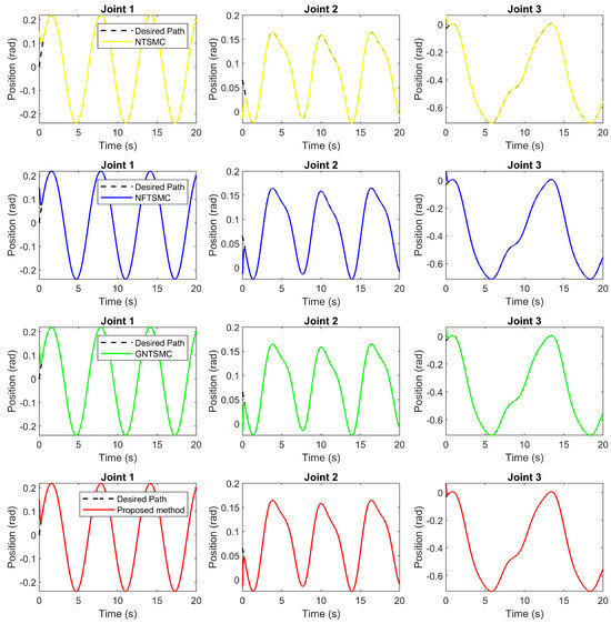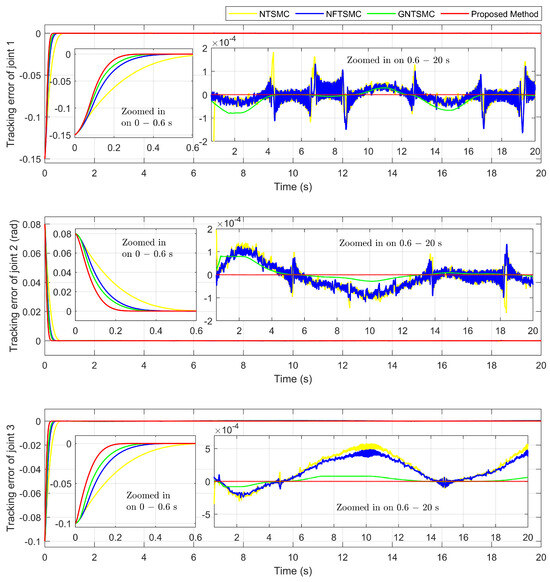With assumed uncertainties, including uncertain dynamics, friction forces, and external disturbances, the proposed method addresses these issues more effectively than the other methods. Consequently, the tracking accuracy of the proposed method remains consistently high throughout the robot’s operation.