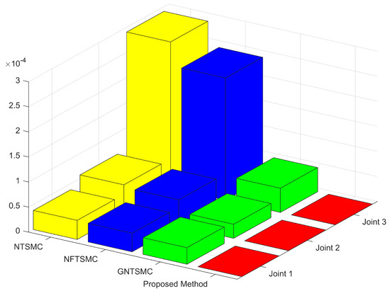 Trajectory tracking accuracy and robustness: A detailed analysis of the tracking accuracy is provided in Figure 8, which compares the tracking errors at the joints, and Figure 9, which highlights the RMSEs of the control methods. During the period from 0.6 to 20 s, as shown in the zoomed-in view of Figure 8 and the RMSEs in Figure 9, the NTSMC and NFTSMC methods exhibit comparable tracking accuracy. Their tracking errors are within the range of to radians, as summarized in Table 2. However, NFTSMC demonstrates slightly superior accuracy compared to NTSMC. The GNTSMC method achieves a further improvement in accuracy, with tracking errors consistently within the range of radians. Most notably, the proposed method outperforms all others, delivering exceptional tracking precision. Its tracking errors remain consistently within the range of to radians, showcasing its significant advantage in ensuring superior accuracy and robustness.