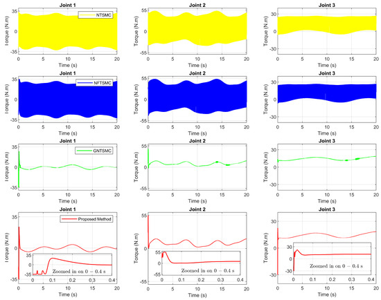 Chattering suppression: Figure 10 presents a comparison of the control input torques generated by the various methods. It is apparent that both NTSMC and NFTSMC exhibit significant chattering in their control signals. This behavior is attributed to the high sliding gain () employed to compensate for the upper bounds of external disturbances and system uncertainties. In contrast, GNTSMC and the proposed method generate substantially smoother control signals, highlighting their enhanced robustness and efficiency. The GNTSMC method leverages a super-twisting algorithm to effectively suppress chattering, while the proposed method achieves similar smoothness with a smaller sliding gain, relying on the TDE approach to handle modeling errors and disturbances. This reduction in gain not only minimizes chattering but also enhances the overall energy efficiency of the control system.