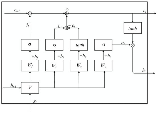 As is shown in Figure 1, the input gate, the forget gate, and the output gate are represented by the letters , , and , respectively. is the element-wise multiplication, and the weight matrices of the network are represented by . denotes the bias vector, and represents the memory cell. and stand for the LSTM hidden layer’s input and output vectors, respectively. The logistic function () and Tanh function (tanh) belong to the sigmoid function.