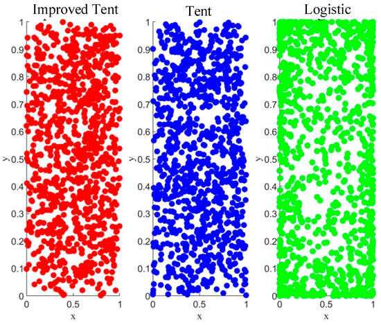 There are two chaotic perturbation equations: The Logistic map and the Tent map, which are mostly used by people. The Logistic map tends to distribute points more evenly around the middle values, but it is significantly more likely to generate points at the extremes. The Tent map is structurally easier, which still provides better uniform traversal, giving the algorithm a higher search speed. What is more, if we use reverse learning to improve the population initialization, we can greatly enhance the convergence speeds, and the mapping point diagrams of three different methods are shown in Figure 2. Thus, to leverage the benefits of both initialization methods, this paper generates the initial population using reverse learning principles and chaotic mapping.