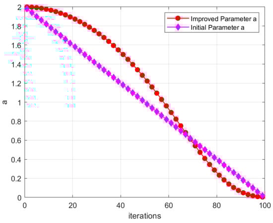 We employ a nonlinear convergence factor to modify the variation curve. According to Equation (3), as a increases, A also increases. From Equations (5) and (6), it can be observed that as A becomes larger, the iteration step size of the optimization algorithm increases, making it easier for the algorithm to traverse the entire design space, and thus enhancing its global convergence performance. However, as the step size increases, the algorithm’s focus on the local region diminishes. Therefore, by reducing the value of a, and consequently decreasing the step size, the local exploitation capability of the algorithm can be enhanced.