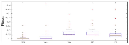 The relationship of different algorithms between fitness and the number of iterations is shown in Figure 5 and Figure 6. From the average iteration processes of the various heuristic algorithms shown in Figure 5, it can be observed that the IWOA converges to the optimal solution across different test functions, exhibiting the fastest convergence speed in all test cases except for F8 and F9. Figure 6 presents a box plot of the optimal solutions obtained by different heuristic algorithms, using F4 as an example. It is evident from the figure that the IWOA algorithm yields a smaller optimal solution and demonstrates higher stability compared to the other algorithms.