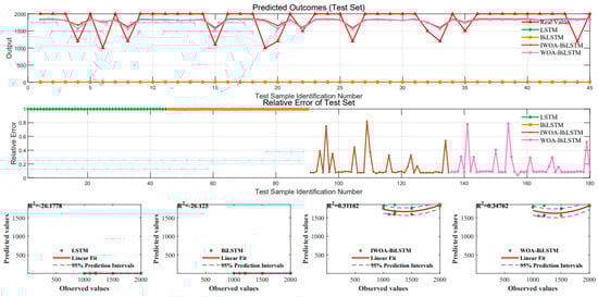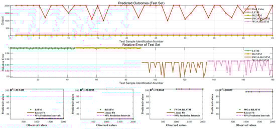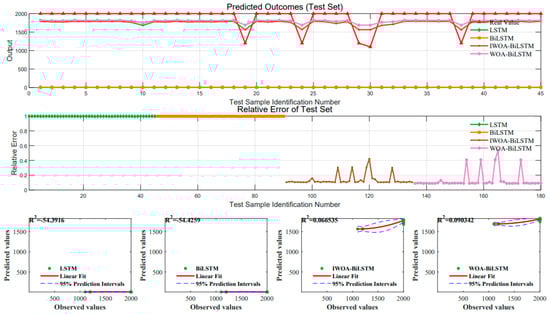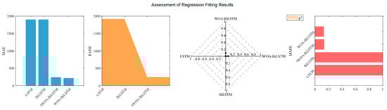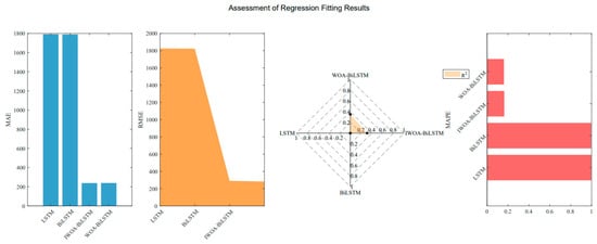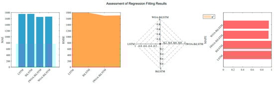 As shown in Figure 17, the LSTM and BiLSTM models without the assistance of optimization algorithms exhibit significant differences in accuracy compared to the BiLSTM model supported by heuristic algorithms. By comparing the R2 values, the BiLSTM assisted by IWOA achieved higher accuracy, demonstrating a stronger ability to capture the characteristics of the real data. As illustrated in Figure 18, the IWOA-BiLSTM obtained superior evaluation metrics.